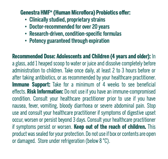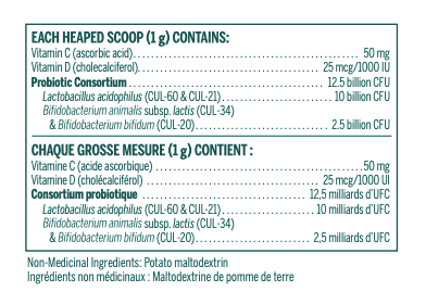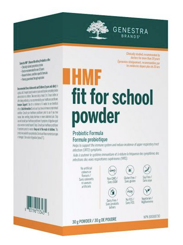 HMF Fit For School Powder includes a combination of research-driven probiotic strains and vitamin C that helps to reduce the incidence of URTI symptoms in children. In a recent clinical trial, 57 schoolchildren were randomized to receive either a placebo tablet or the probiotic strains included in HMF Fit For School Powder’s formula plus 50 mg of vitamin C daily for six months. Children in the probiotic plus vitamin C group had 33% less incidence of URTI, a significant decrease in the number of days with URTI symptoms, and a 30% decrease in school absenteeism.1 Each heaped scoop also includes 25 mcg (1,000 IU) of vitamin D for additional immune support and to promote adequate vitamin D status for healthy bone development.