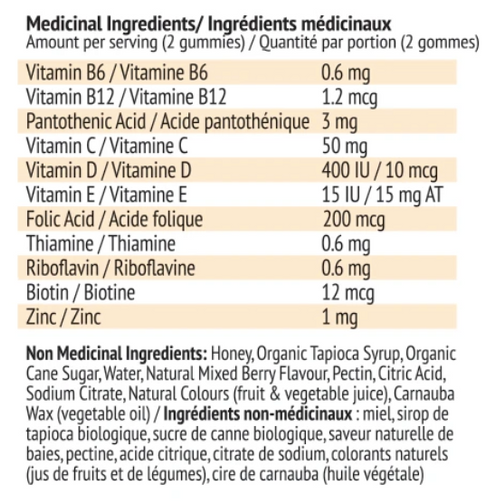 Medicinal Ingredients (per serving): Vitamin B6 0.6 mg, Vitamin B12 1.2 mcg, Pantothenic Acid 3 mg, Vitamin C 50 mg, Vitamin D 400 IU/10 mcg, Vitamin E 15 IU/15 mg AT, Folic Acid 200 mcg, Thiamine 0.6 mg, Riboflavin 0.6 mg, Biotin 12 mcg, Zinc 1 mg