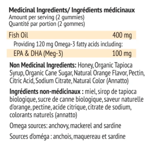 Medicinal Ingredients (per serving): Fish Oil 400 mg (Providing 120 mg Omega-3 fatty acids including: EPA & DHA (Meg-3) 100 mg)
