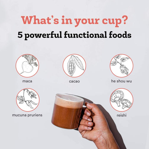Brew a cup of calm with our cacao-based daily supplement. This antioxidant-rich, blissful blend of functional botanicals features Reishi, the stress and immune-supporting "Queen of Mushrooms".