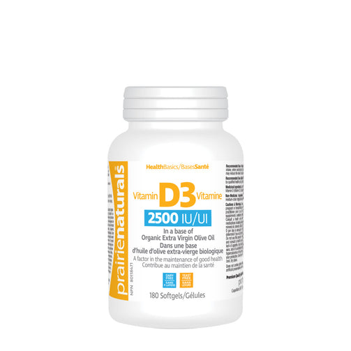 Prairie Naturals is proud to introduce our Vitamin D 2500 IU Softgels in a base of Organic Olive Oil. Prairie Naturals Vitamin D3 is made with cholecalciferol, the most readily absorbed form. Be sure you get enough of this low-cost, highly valuable vitamin. You’ll soon feel the difference that Vitamin D makes to your health and happiness.