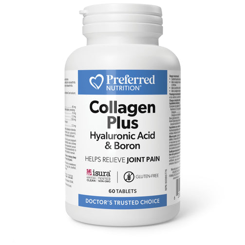 Preferred Nutrition Collagen Plus Hyaluronic Acid & Boron combines three clinically researched ingredients in one daily tablet to help reduce joint discomfort caused by exercise or osteoarthritis. Each tablet provides 40 mg of UC-II® collagen to help support joint health. Hyaluronic acid provides added support, and boron helps maintain healthy calcium metabolism.