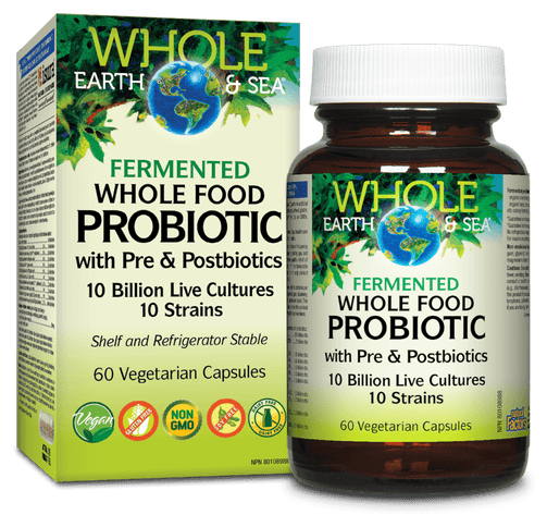 Whole Earth & Sea Fermented Whole Food Probiotic provides 10 billion active cells of 10 strains of beneficial bacteria per capsule. Made through natural fermentation processes with an organic fermented prebiotic blend, this vegan-friendly, one-per-day synergistic synbiotic formula helps support gastrointestinal health and wellness.